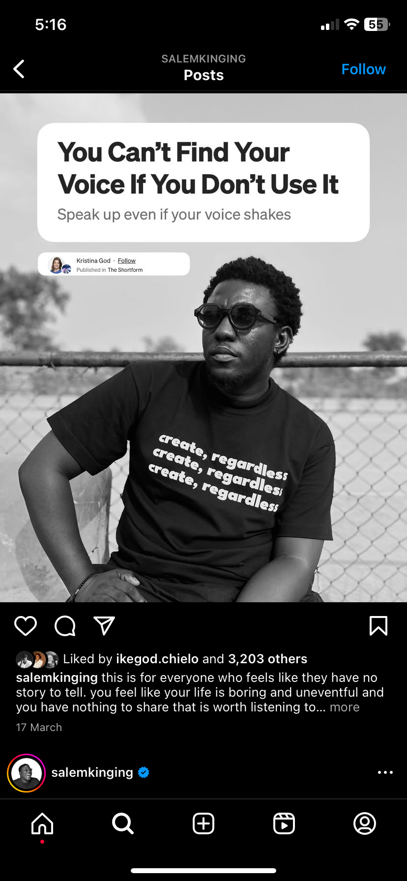 I am part of Salem King’s commYOUnity and everyday I watch content where his only message to us is - START CREATING but the truth is I did not where to start from and my fear of facing that challenge became my limit. It is important that we don’t wait until we are confident to show up but show up until we are confident.